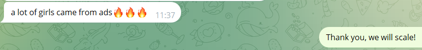 The ad was launched for the lead form target. The girls follow the advertisement and fill out the form leaving their contacts there. Then their applications fell into the telegram group, after which our manager contacted them and conducted a step-by-step interview to understand whether this model is suitable for the client or not. After four weeks of advertising, the client wrote to us: